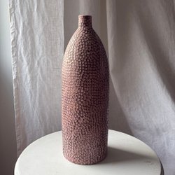 En rosa vas för blommor.