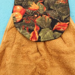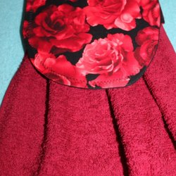 Hängande handduk med svart topp och vit spetskant. Handduken är vit med tunna svarta ränder och fästs med en vit knapp.