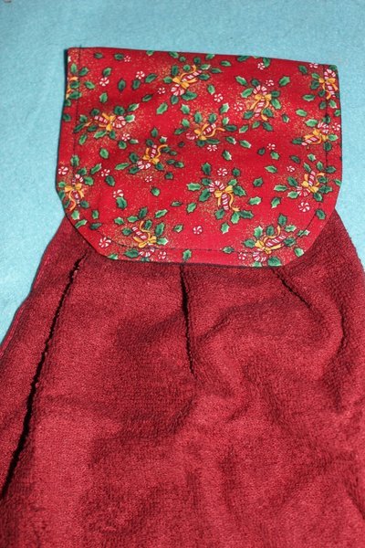 Handduken är i vinröd frotté. Vlieselin i överdelen.