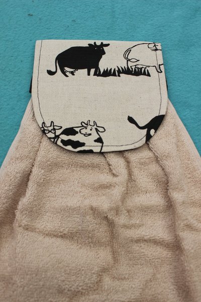 Handduken är i beige frotté. Vlieselin i överdelen. (A G Pehrssons tyg).