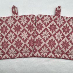 Grytlappar, välsydda i kraftig bomull med älgar i vitt på tegelfärgad botten.