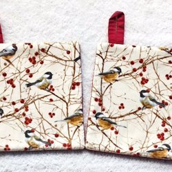 Handgjorda, välsydda och stora: ca 20,5 cm x ca 19,5 cm varje. Med värmetåligt mellanlägg speciellt för grytlappar. Svart baksida. Bomullstyg. Nytt kvalitetsmaterial. Gediget hantverk. Mönstrets placering kan skilja sig något från bilderna.