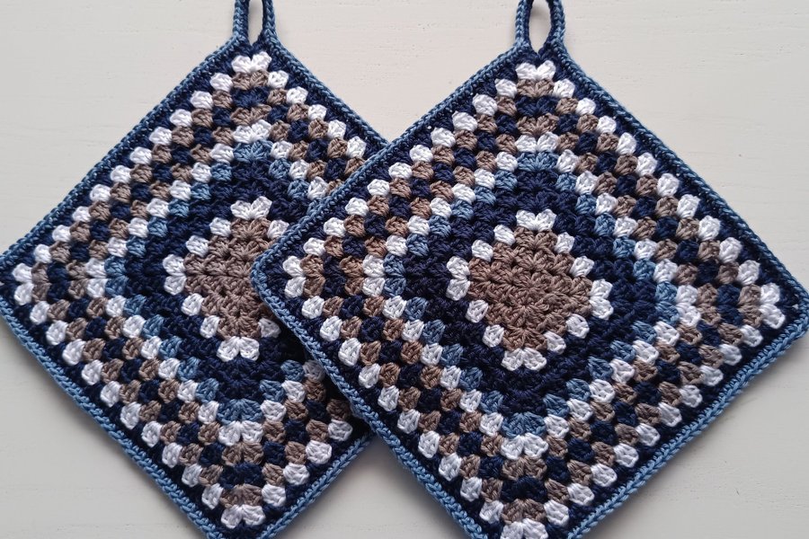 Ett par dubbelvirkade tjocka grytlappar i mörkblått, mörkgrått, denimblått och även lite vitt. Virkade i bomullsgarn och lika på båda sidor. Storlek ca 17 x 17 cm.