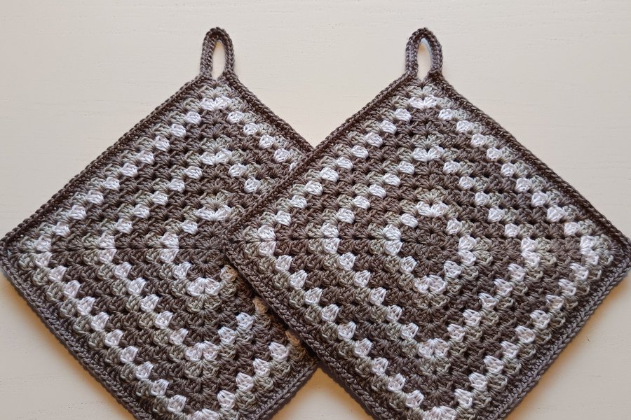 Ett par dubbelvirkade tjocka grytlappar i mörkgrått, ljusgrått och även lite vitt. Virkade i bomullsgarn och lika på båda sidor. Storlek ca 17 x 17 cm.