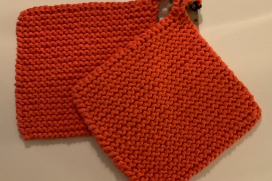 Två orangea handstickade grytlappar i återvunnet garn. Garnet är tubspunnet vilket gör att dom står emot värmen otroligt bra, maskintvättbara
