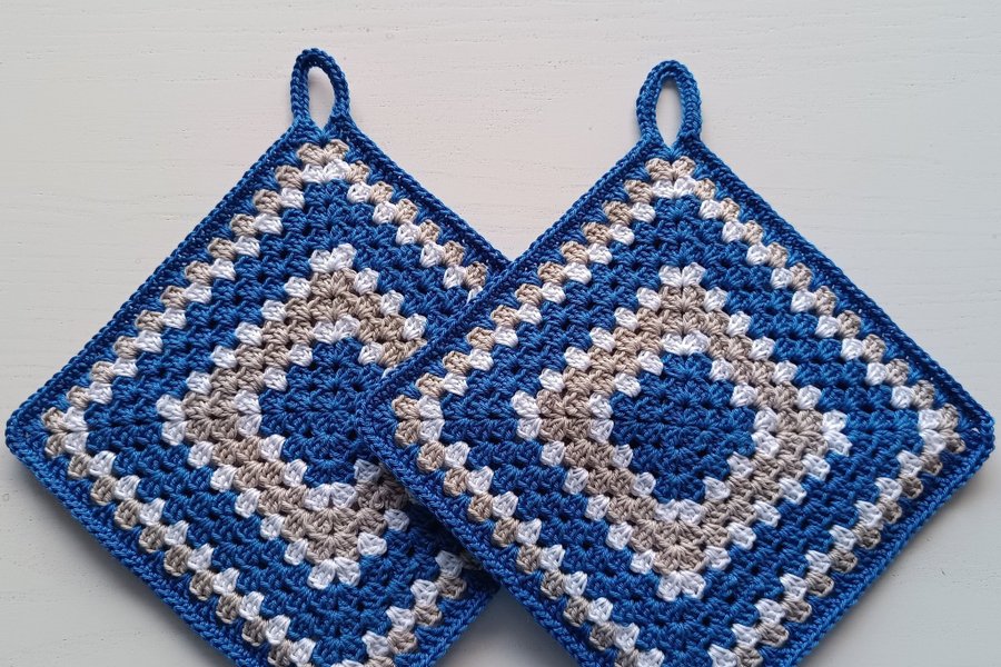 Ett par dubbelvirkade tjocka grytlappar i klarblått, ljusgrått och även lite vitt. Virkade i bomullsgarn och lika på båda sidor. Storlek ca 17 x 17 cm.