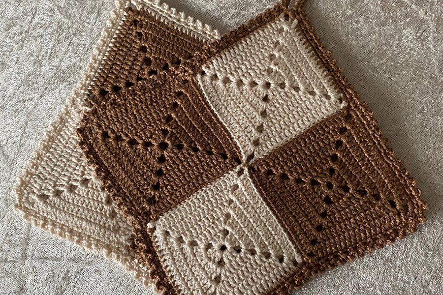 Virkade grytlappar i cappuccinofärger