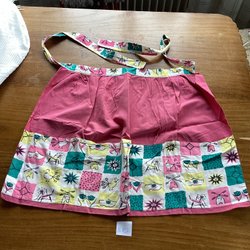 Ett sött förkläde från tiden med ett blommigt mönster i blått, rosa och vitt.