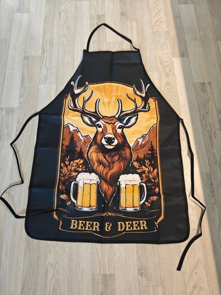 Ett svart förkläde med tryck av ett rådjur och texten "Beer & Deer".