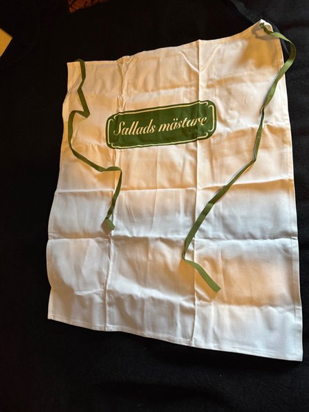 Vitt förkläde med texten ”Sallads mästare” i grönt. Förklädet har gröna band att knyta runt midjan och nacken.