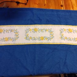 73 cm långt midja 48 cm + band 58 x 2. Halsknytband 63 x2 cm vidd nedtill 80 cm.