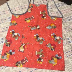 Rött förkläde med vita prickar och gröna detaljer. Förklädet har en ficka framtill och knytband i nacken och midjan.