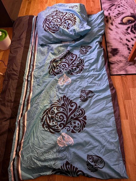 Ett fint påslakanset i blått med dekorativa mönster. Perfekt för att ge sovrummet en ny stil. Katt kanin finns i hemmet. Mitt ansvar upphör vid post inlämningen. (Använd endast i 3 nätter.)