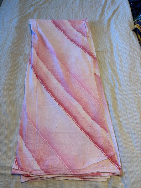 Ett påslakan med ett mönster av diagonala ränder i olika nyanser av rosa och vitt. Ränderna har en spräcklig textur och är avgränsade med tunna vita linjer. Lakanet är vikt och ligger på en ljus, randig yta. Inget örngott