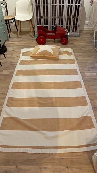 Ett randigt överkast med tillhörande kudde med stjärnmotiv.