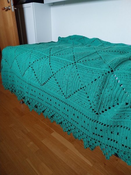 Virkat överkast till dubbelsäng 230x240cm. Färgen på överkastet är lite missvisande då det är mer mörkgrönt 70-tal
