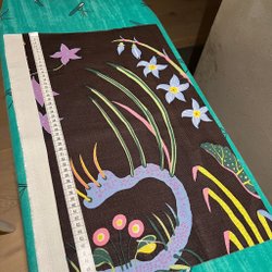 vackert tyg, ganska tunt bomull eller viskos tror jag ca 110 långt och drygt 40 brett. Färgerna klarare än på bild