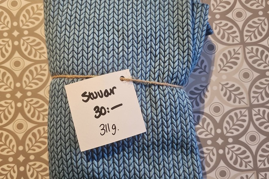 Blå tygbit med ett intressant mönster. Perfekt för sömnadsprojekt eller andra kreativa idéer. Stuvbitar som väger 311 gram.
