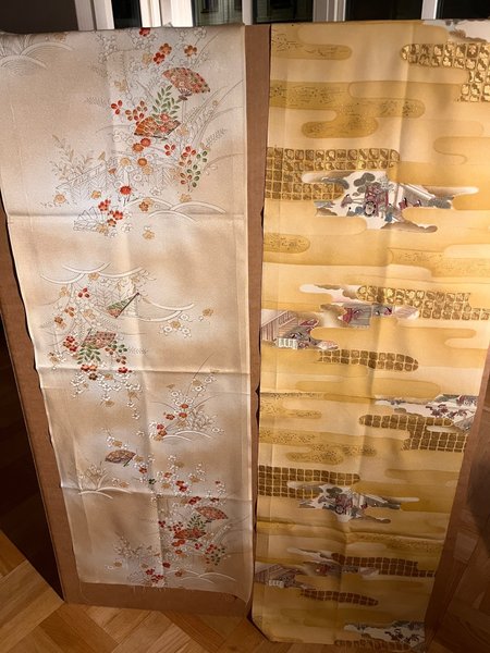 Två stuvar från Japan. Den gula 157x35, den med solfjädrarna 104x39. Japanskt tyg tex för kimono och obi. Väldigt skirt.