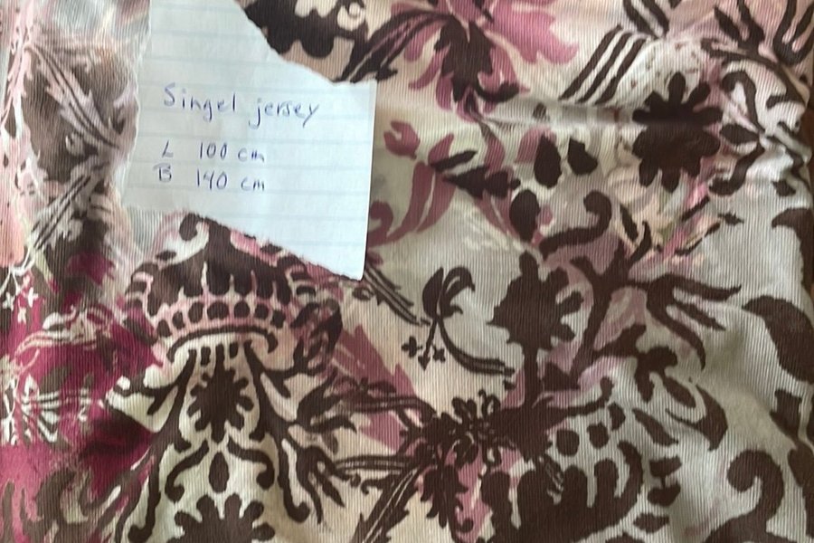 Ett tyg med ett blommigt mönster i rosa och bruna toner. Måtten är 100 cm i längd och 140 cm i bredd.