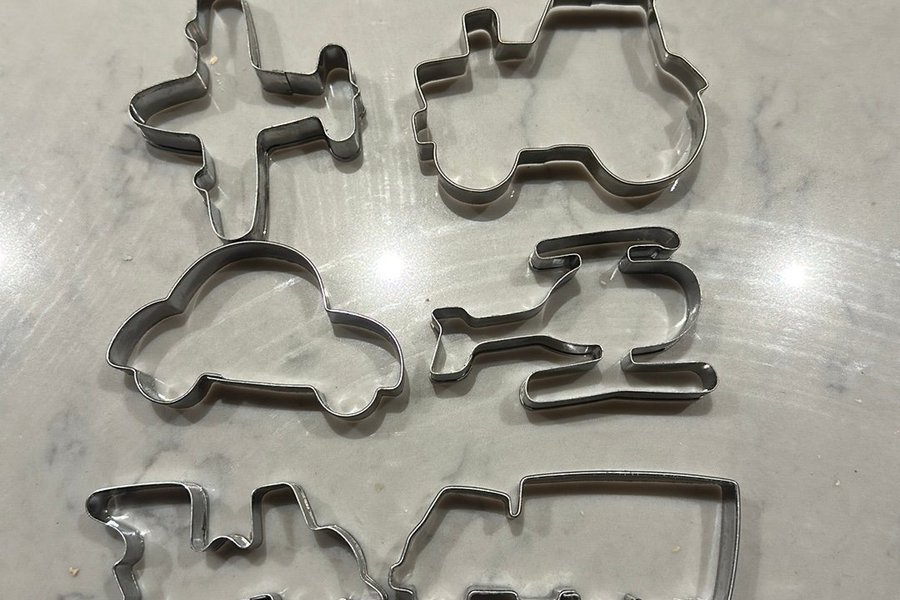 Kakformar med olika transportmedel: flygplan, traktor, bil, helikopter, tåg och lastbil.
