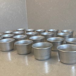 Ett set med vintage bakformar. Minsta ca 12 cm i diameter upptill, de andra 16, 17 och 21 cm
