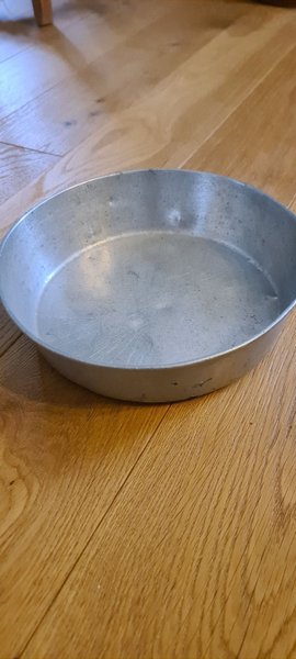Bakform i metall. 6 cm hög kant och 20 cm i diameter. Repor i botten och bucklig.