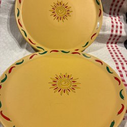 De är vita med en lila kant och ett blommönster i lila och rött. 24 cm i diameter. Väger tillsammans drygt 1 kg. Inga nagg. Samfraktar.