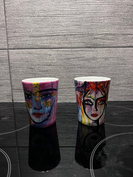 Två muggar med olika ansiktsmotiv. Perfekt för kaffe eller te.