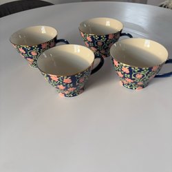 Tre stycken koppar från Indiska, etablerade 1901. Kopparna har ett blommigt mönster.