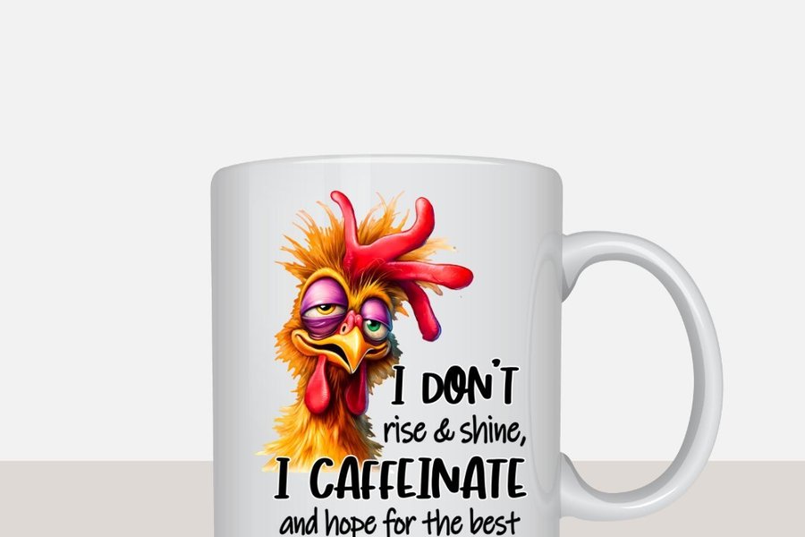 Mugg med texten "I don't rise & shine, I caffeinate and hope for the best". Alla våra muggar kan anpassas helt efter dina önskemål!