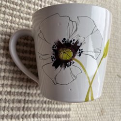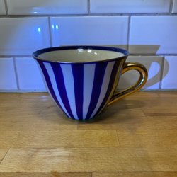 En te kopp med tillhörande fat. Dekor med blommor och guldfärgade detaljer.