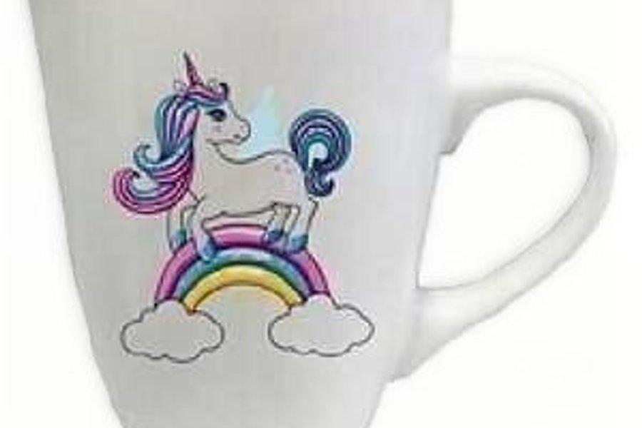 Vit mugg dekorerad med en söt enhörning som står på en regnbåge. Perfekt för alla som älskar enhörningar!