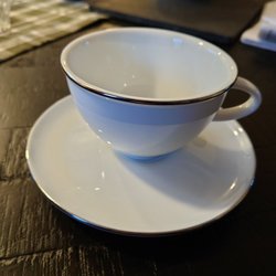 Kopp med fat från Rörstrand, modell VIOLA. Dekorerad med blått mönster. Dekorationen är underglasyr och tål maskindisk.