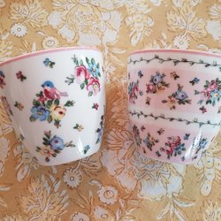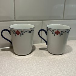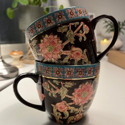 2 st muggar i blått med vita ränder. Märket är ”Black Design”.