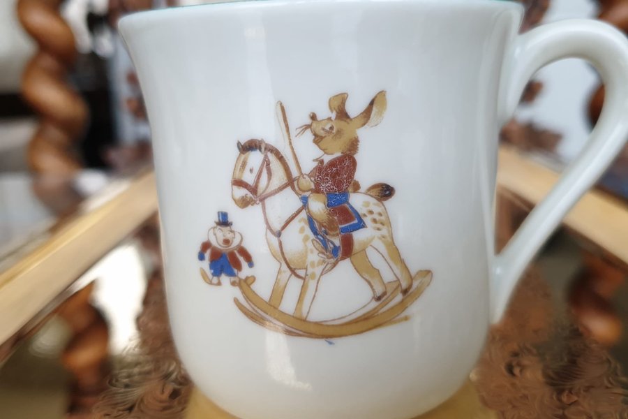 En söt mugg med ett motiv av en kanin på en gunghäst och en liten figur.
