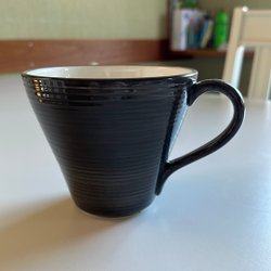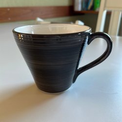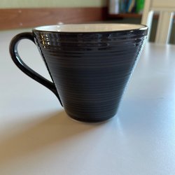 Mugg från Bruka Design Stockholm. Handmålad i blått med horisontella ränder. Vit insida och blå kant.