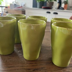 Fina keramik muggar i gul och grön färg. Totalt 4 stycken. Finns en matchande kanna som jag också säljer