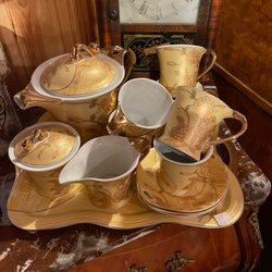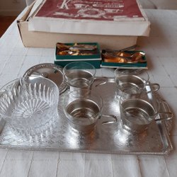 En komplett teservis med glas, fat och skedar. Perfekt för teälskare!