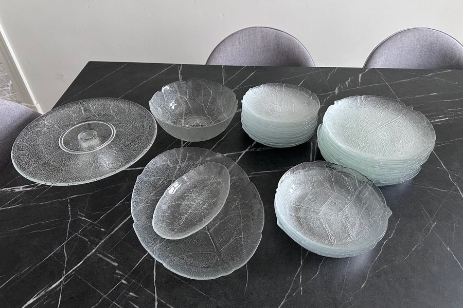 Assietter och skålar med lövmönster.