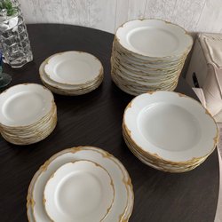 En servis från Rörstrand med guldkant och mönster. Servisen innehåller mattallrikar, djupa tallrikar, assietter, uppläggningsfat och såssnipa. 12 st mindre tallrikar diameter 21 cm