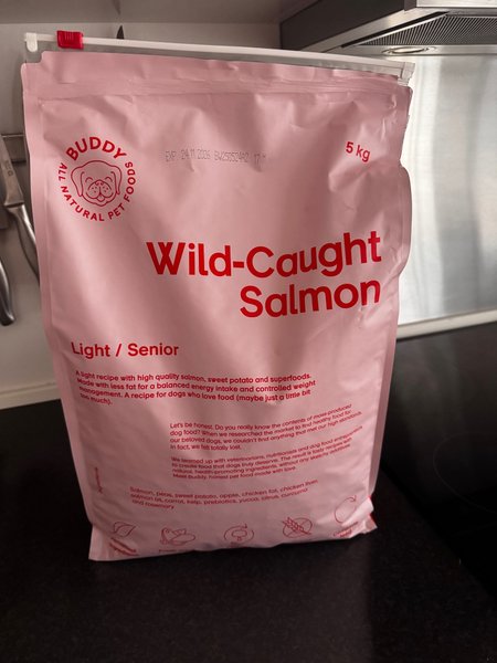 Buddy Pet food: Wild caught - Salomon (5kg). Ett helfoder med vildfångad lax anpassat för hundar med låg aktivitetsnivå, till exempel äldre och mindre aktiva hundar.