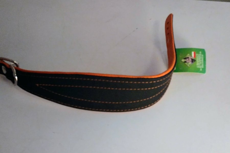 Hundhalsband i läder, färg orange/svart. Mått 6 cm brett på bredaste stället, runt hals 36 cm smalast, 40 cm störst.