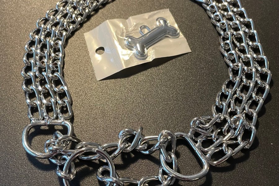 Kraftig hundkedja ,helt ny ,bredd 3cm , diameter ca 58 cm . Passar lite större hundar