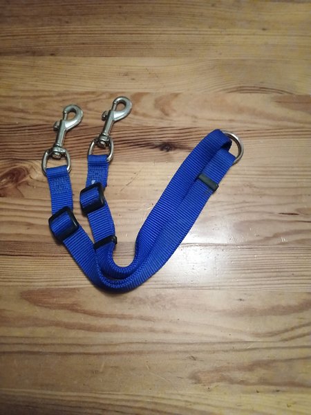 Blå nylon med två karbinhakar i metall.Tvillingkoppel: För att kunna promenera med två hundar i samma koppel genom att fästa karbinhakarna i varsitt halsband och ringen i ett vanligt koppel.
