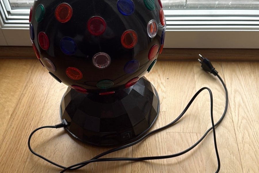 Discolampa med färgglada ljus. Lampan har en svart bas och en svart klotformad ovandel med runda, färgade linser i rött, grönt, blått och vitt. En strömbrytare finns på basen. Strömkabel med stickkontakt ingår.