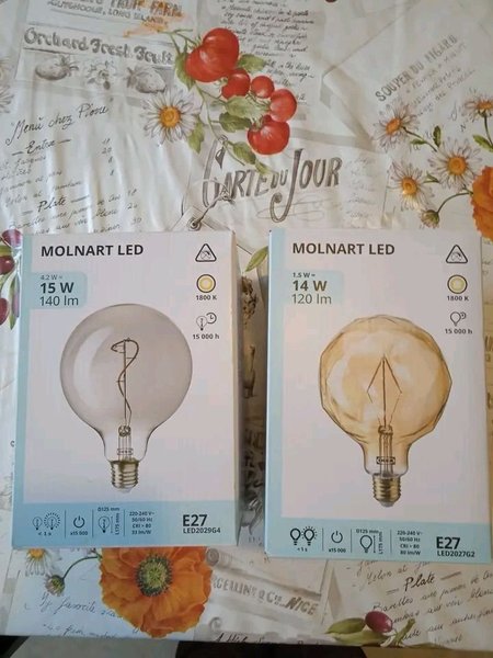 Två Ikea MOLNART LED lampor med E27 sockel. Den ena lampan är på 4.2 W, 140 lm och har en färgtemperatur på 1800 K. Den andra lampan är på 1.5 W, 120 lm och har också en färgtemperatur på 1800 K. Båda lamporna har en livslängd på 15 000 timmar och en diameter på 125 mm. De är dimbara och har ett CRI-värde på över 80.