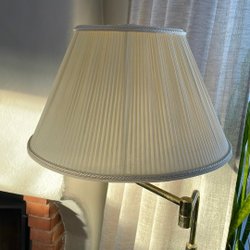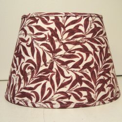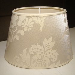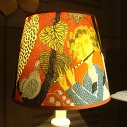 en rund skärm i ett mönstrat tyg och en guldfärgad detalj på toppen. Perfekt som stämningsbelysning.