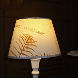 en rund skärm i ett mönstrat tyg och en guldfärgad detalj på toppen. Perfekt som stämningsbelysning.