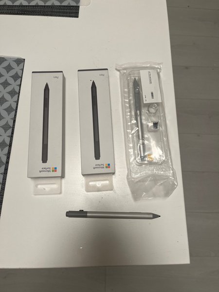 Fyra Microsoft Surface Pen i obruten förpackning. En HP Active Pen i obruten förpackning. En Microsoft Surface Pen utan förpackning.